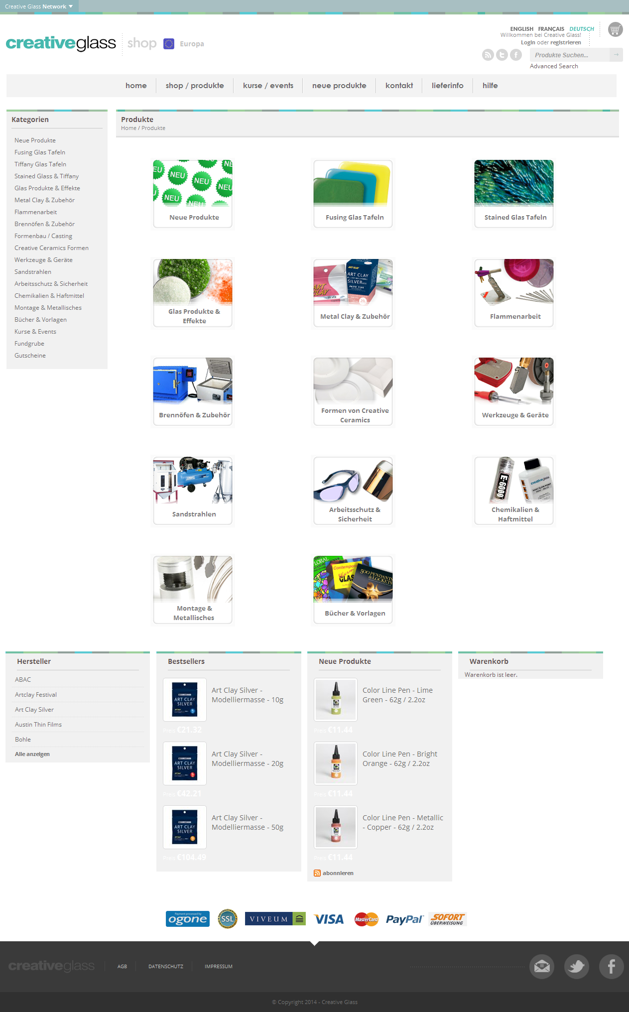Creative Glass` online store for international business with paints and glass. The shop operates in 3 languages: English, French and German.